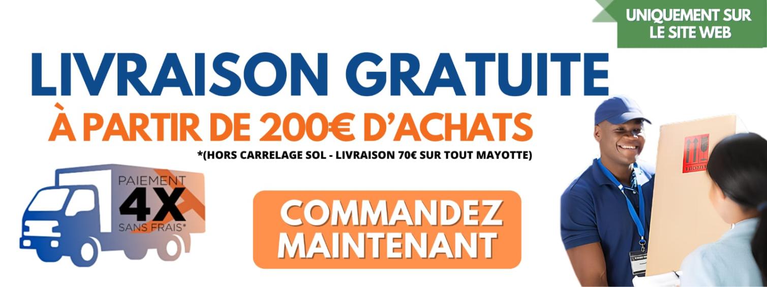 Notre souhait est de toujours vous satisfaire au moindre prix, c’est pourquoi, elle sera dorénavant gratuite pour tout achat en ligne supérieur à 200€. (Hors carrelage sol, la livraison est à 70€ sur tout Mayotte)